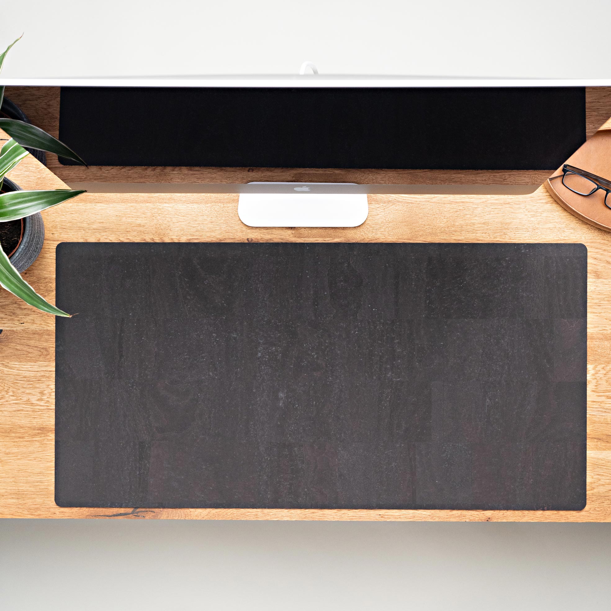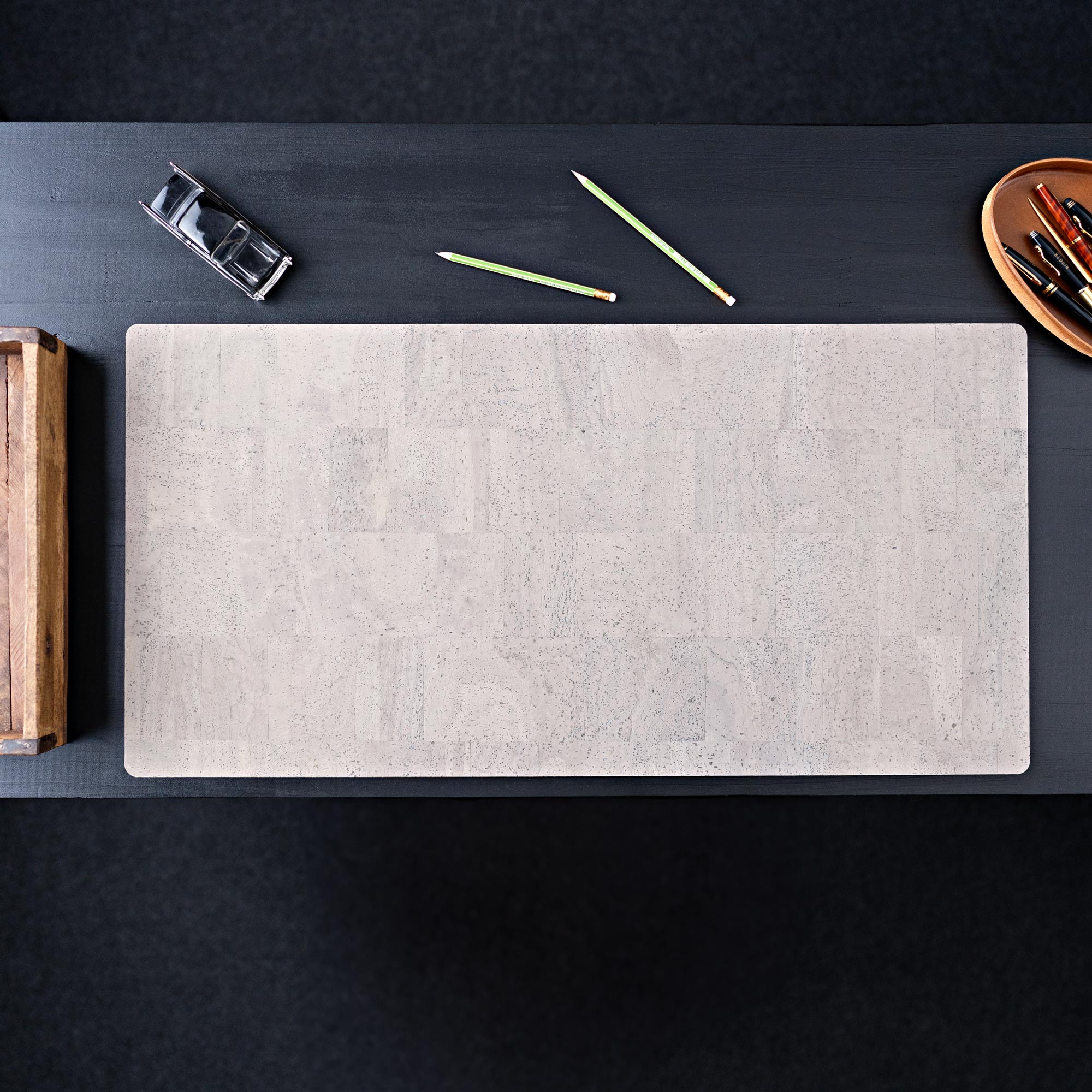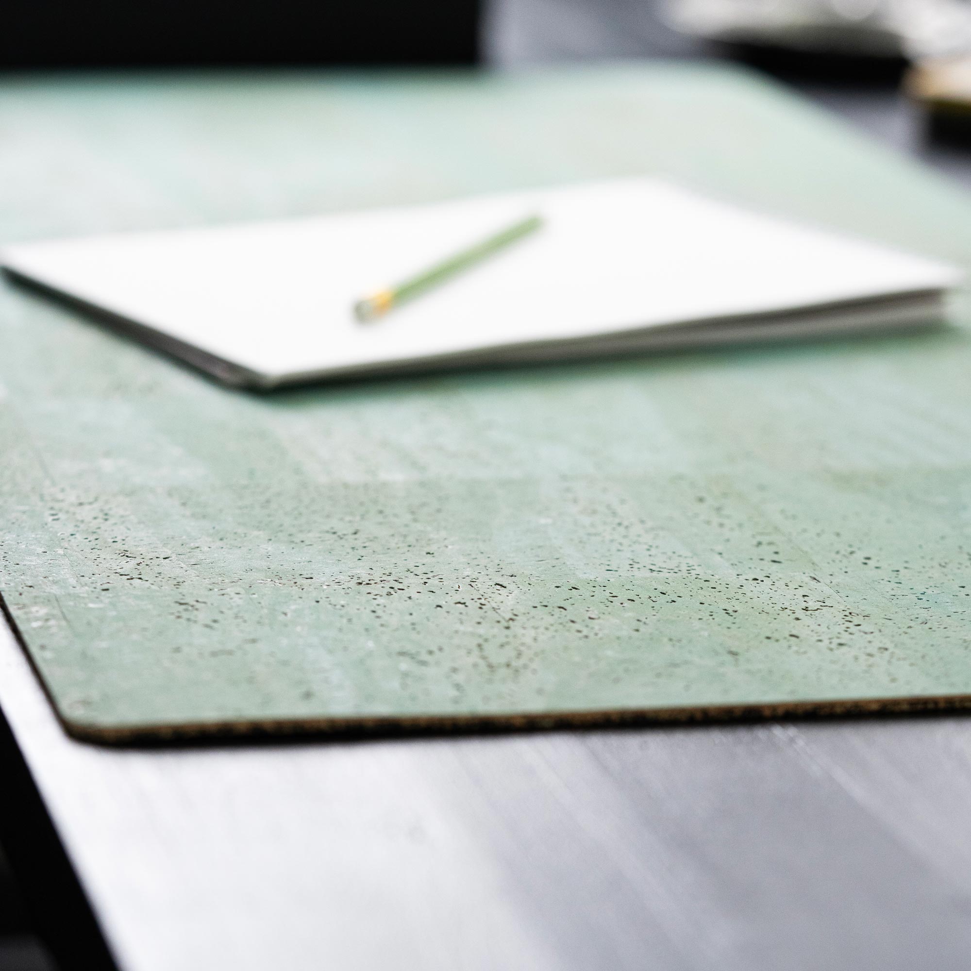 The top surface of the desk pad is made of 100% cork leather, a continuous layer of cork that is durable and robust. The back is made of a cork-rubber mixture that ensures the cork desk pad doesn't slip. Together, they create a truly great material combination that we are very proud of.