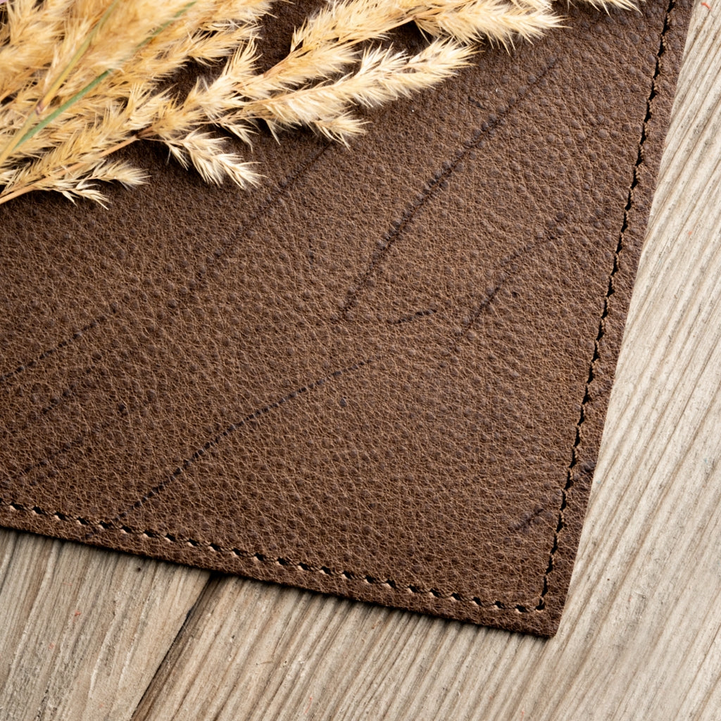 Unlike plastic-coated leather, these placemats develop a patina and age naturally, just like grandpa's hundred-year-old leather chair. Our leather is plastic-free. As a result, natural characteristics are visible on the surface, and the color is not 100% uniform.